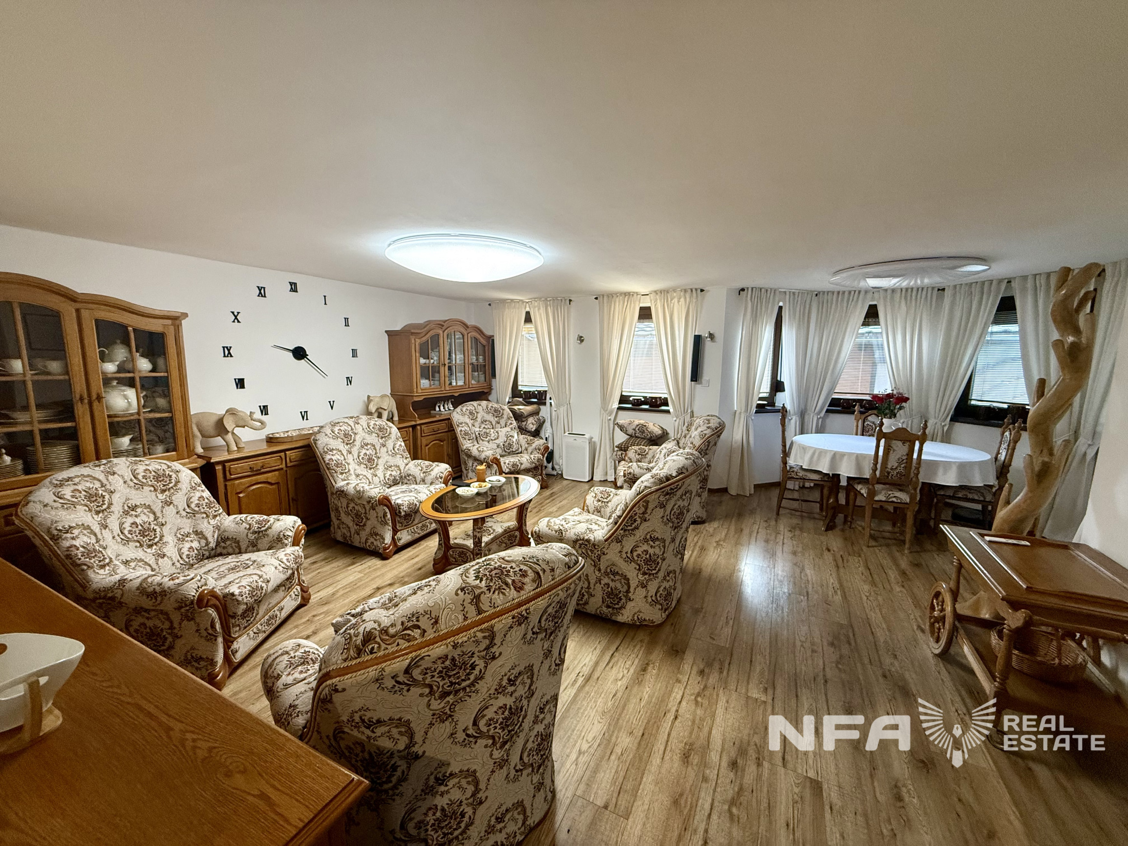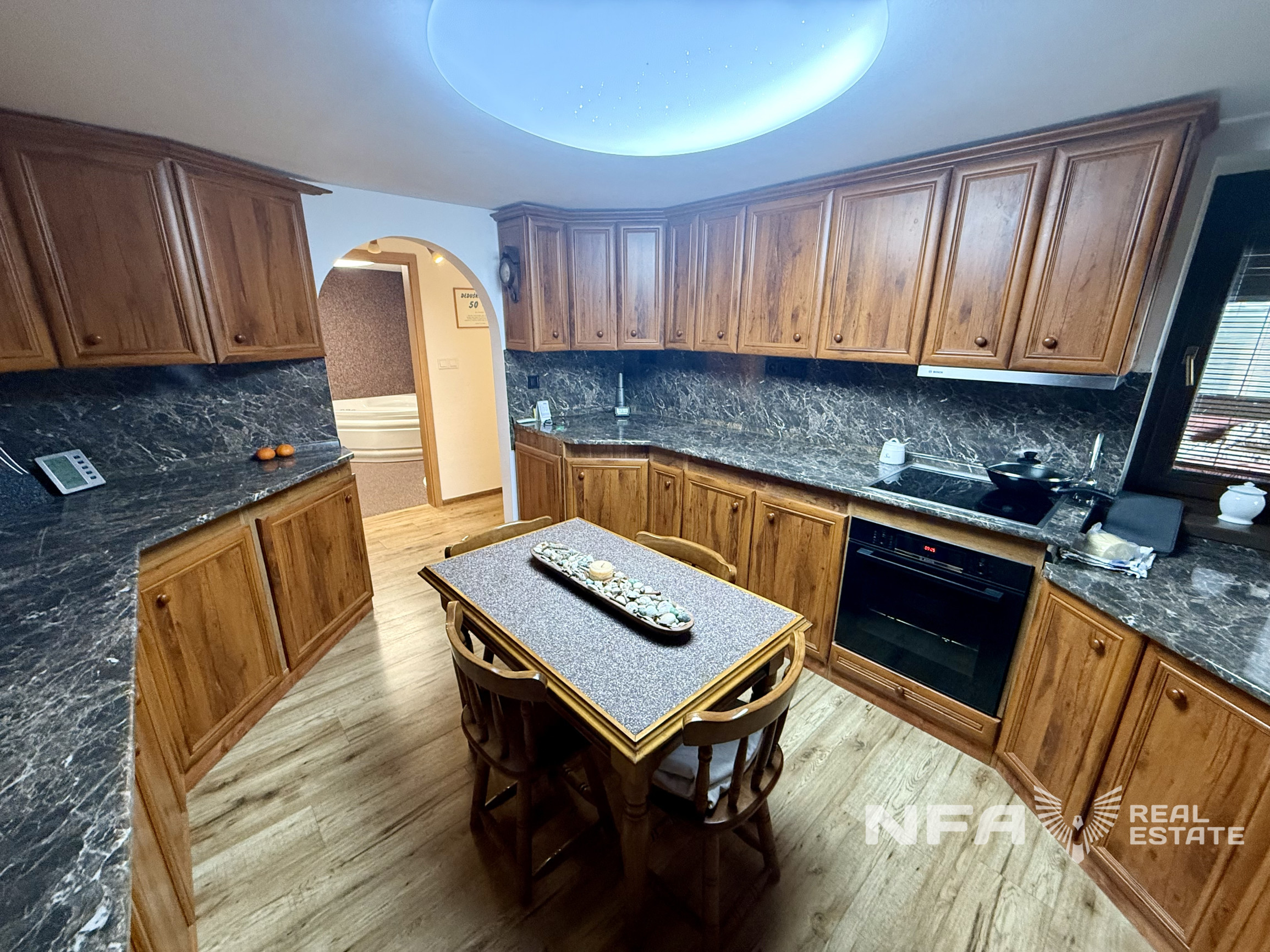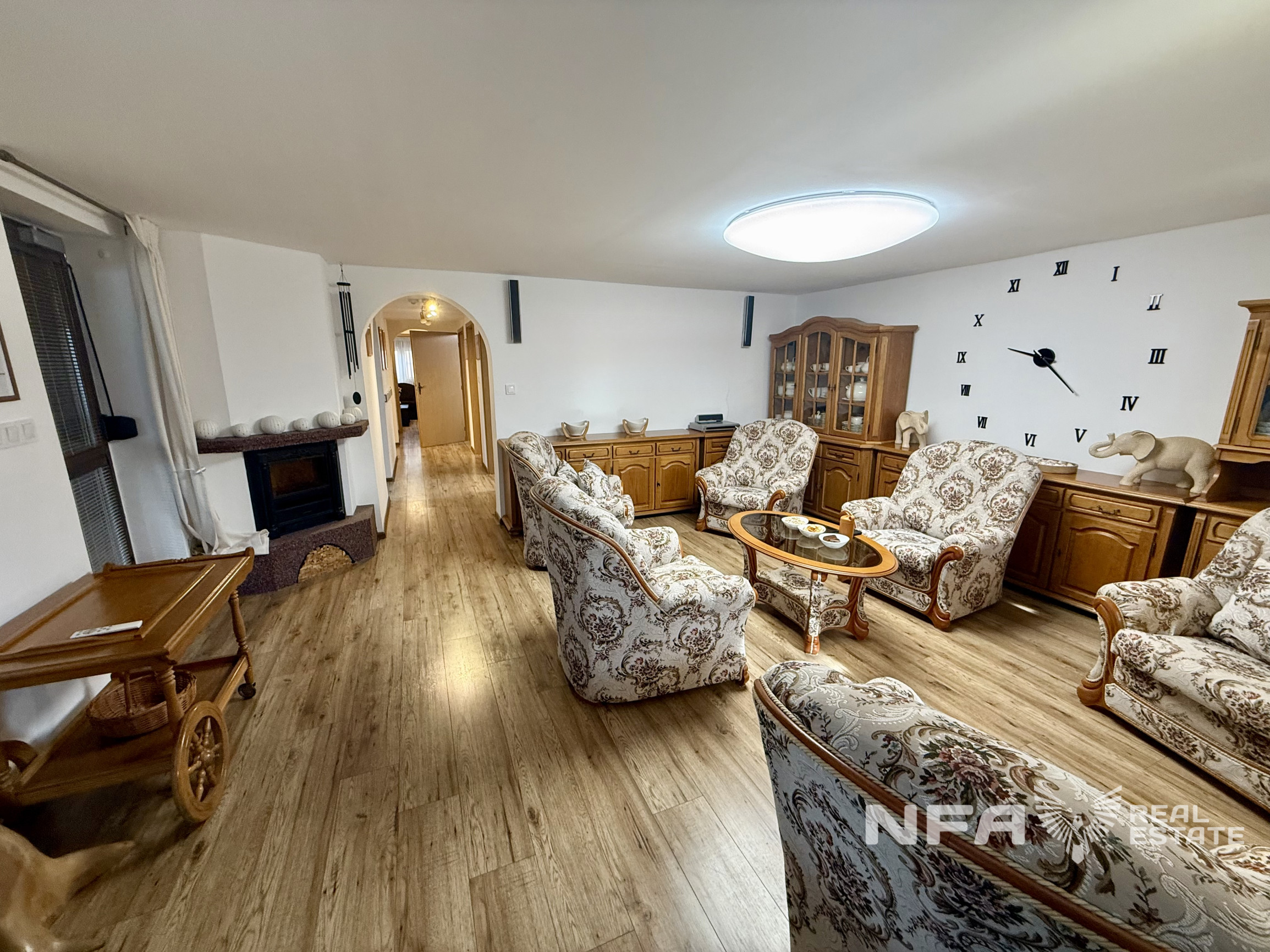 Dominantou nehnuteľnosti je veľká obytná miestnosť so siedmimi oknami, ktoré zabezpečujú dostatok denného svetla a vytvárajú príjemnú atmosféru priestoru. Súčasťou domu je aj veľká kuchyňa s kuchynskou linkou vyrobenou na mieru. Interiér je riešený prevažne na mieru, čo podčiarkuje kvalitné spracovanie a jednotný štýl bývania. V dome sa nachádzajú dva elektrické krby.