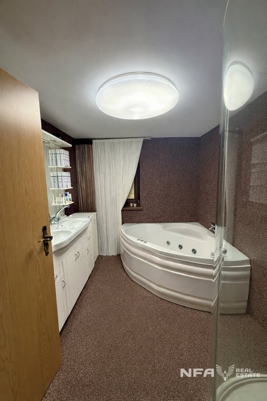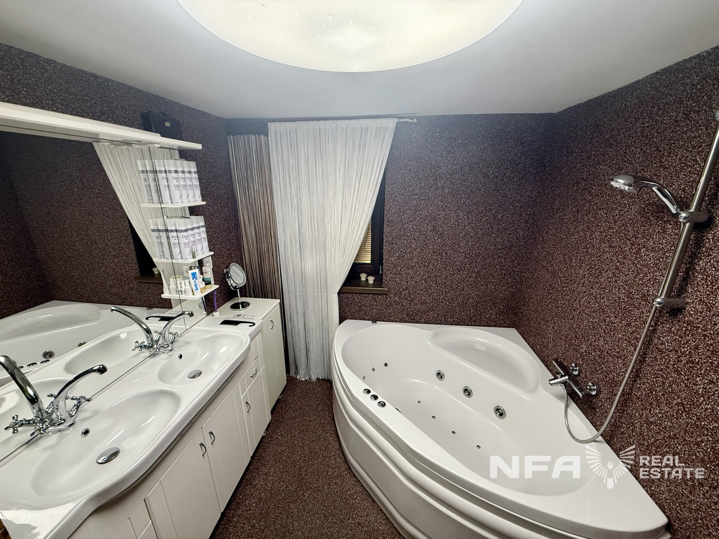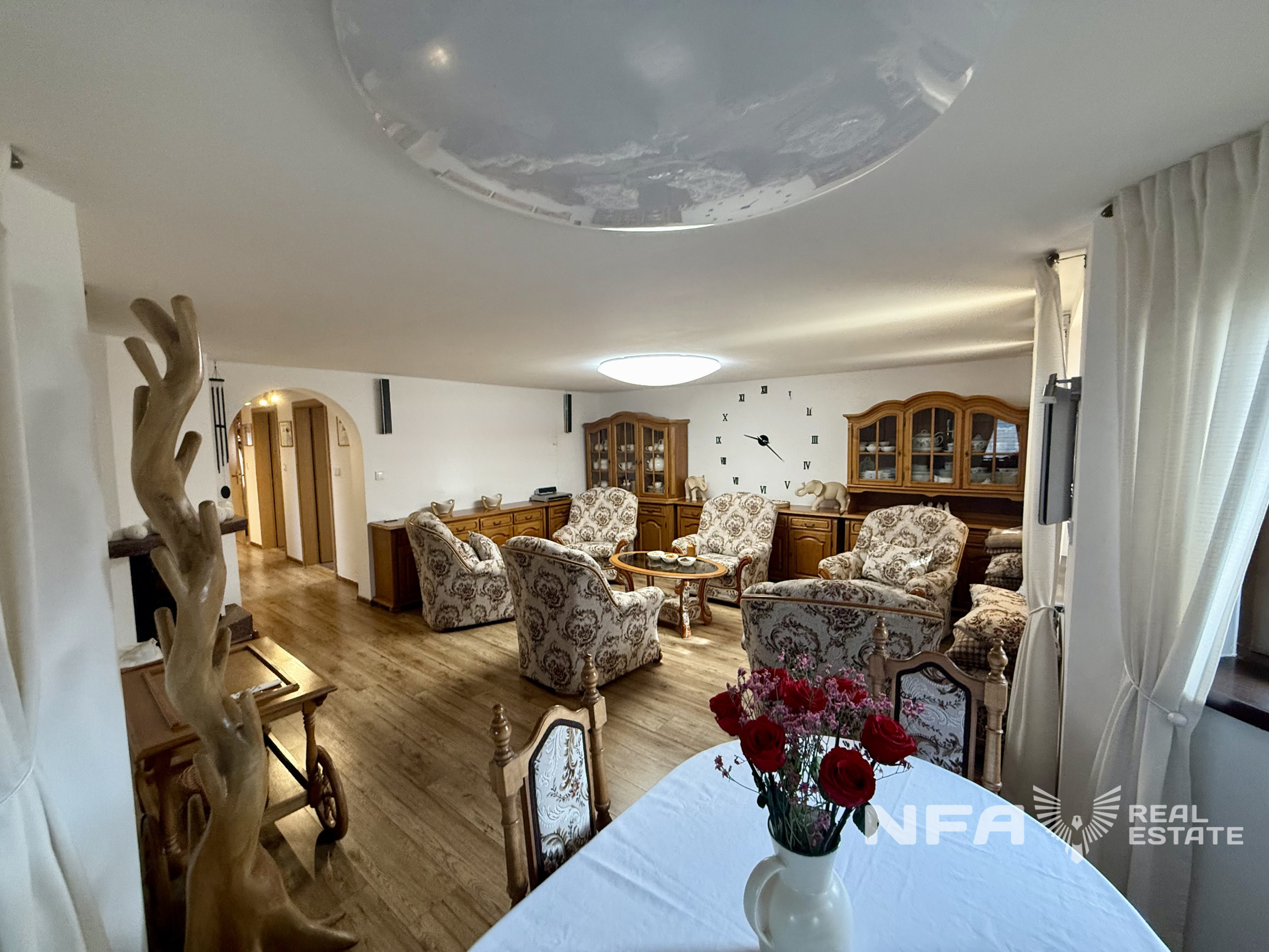 Dominantou nehnuteľnosti je veľká obytná miestnosť so siedmimi oknami, ktoré zabezpečujú dostatok denného svetla a vytvárajú príjemnú atmosféru priestoru. Súčasťou domu je aj veľká kuchyňa s kuchynskou linkou vyrobenou na mieru. Interiér je riešený prevažne na mieru, čo podčiarkuje kvalitné spracovanie a jednotný štýl bývania. V dome sa nachádzajú dva elektrické krby.