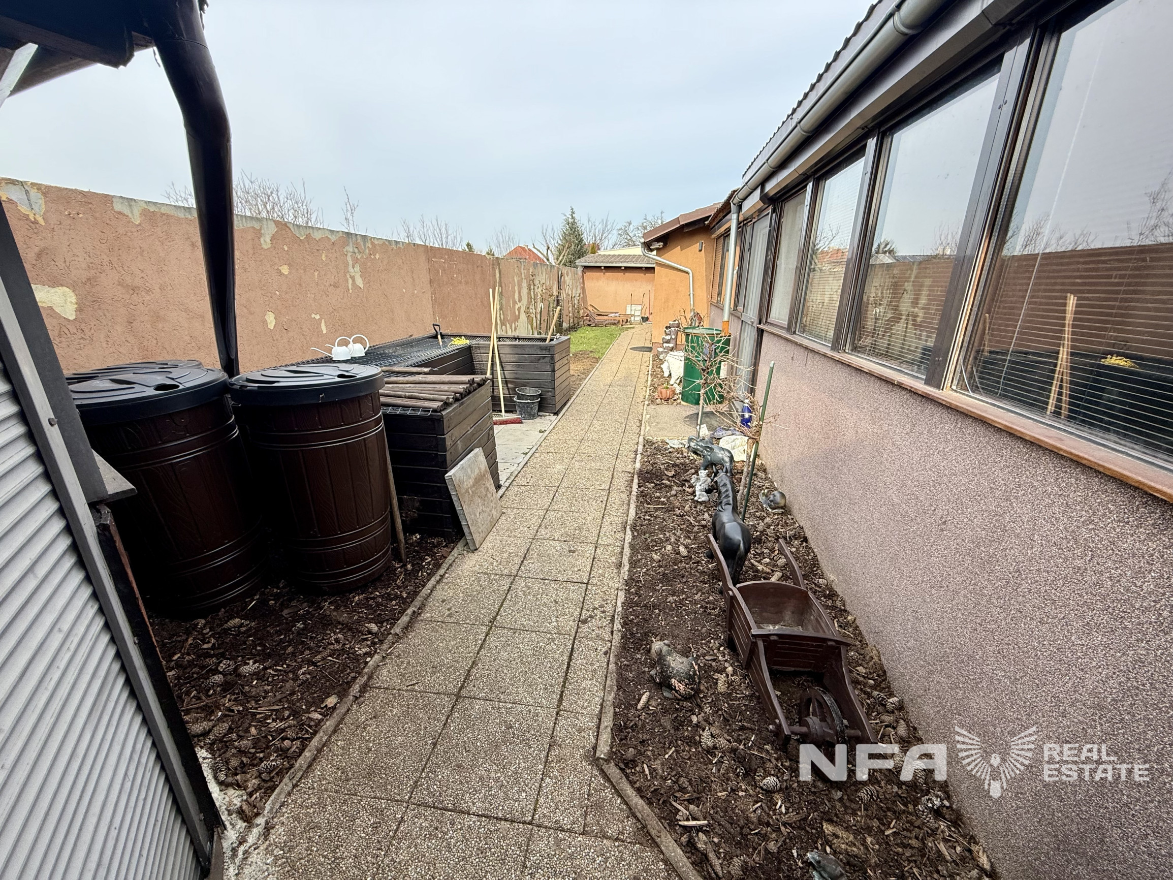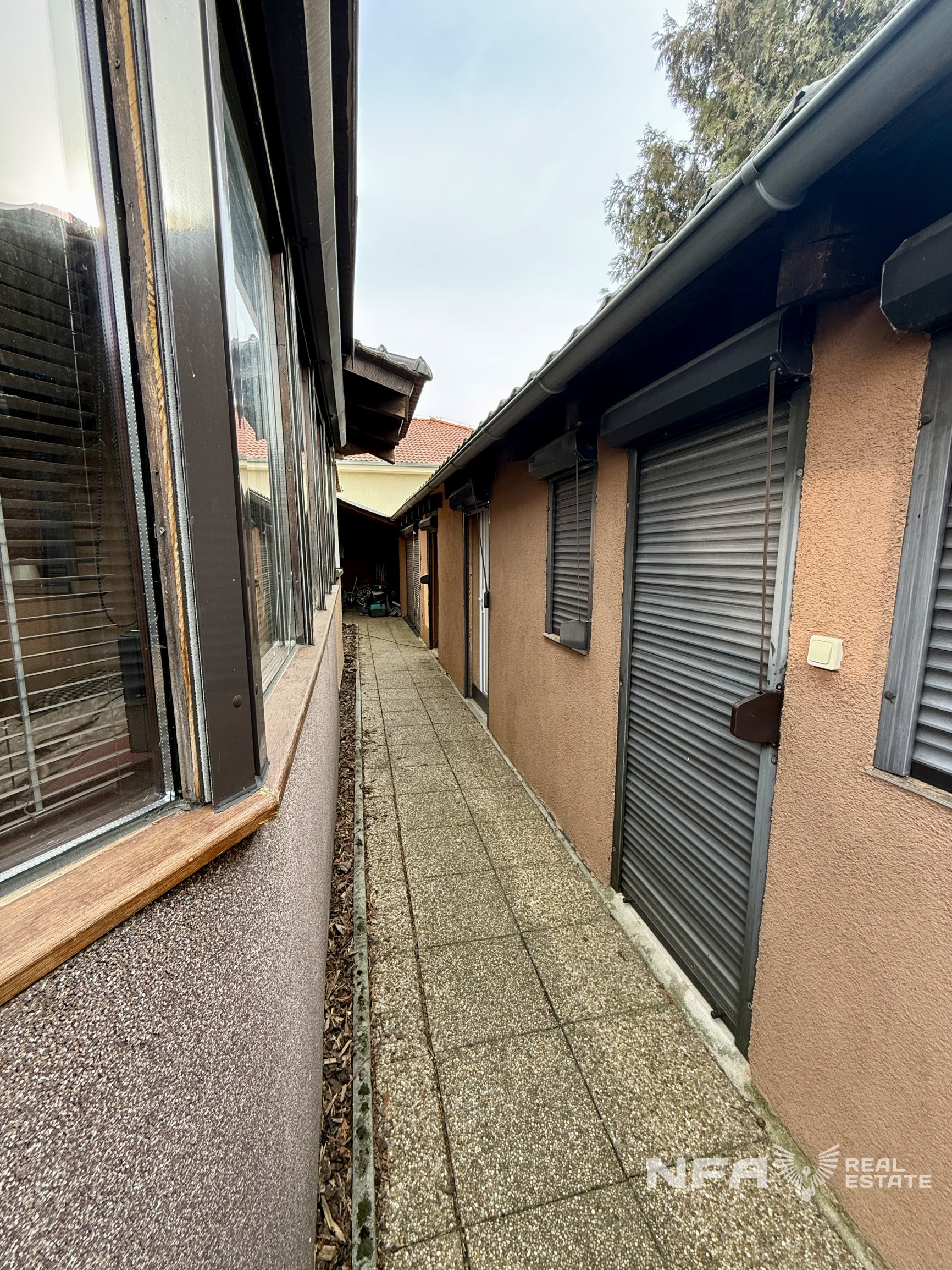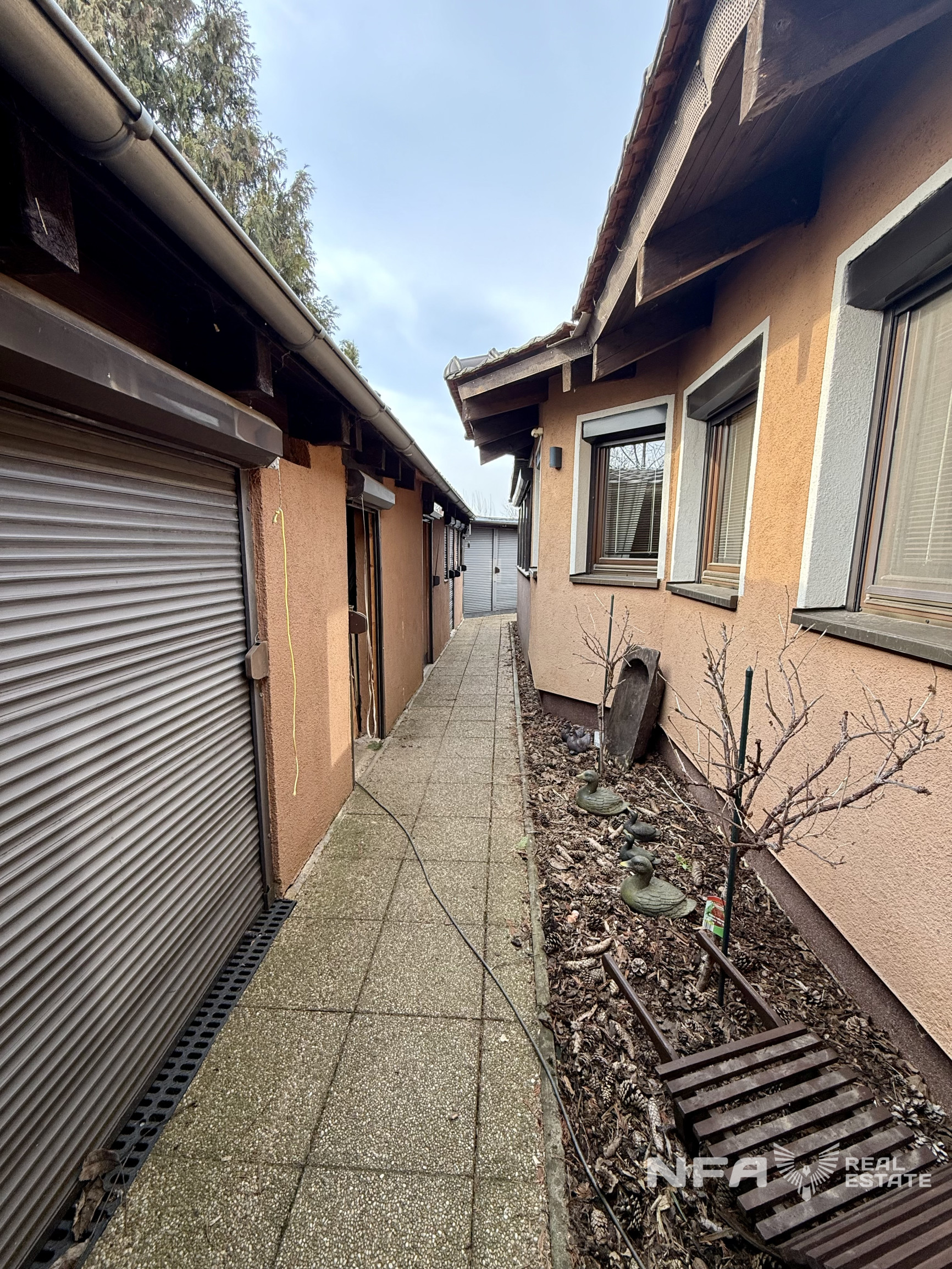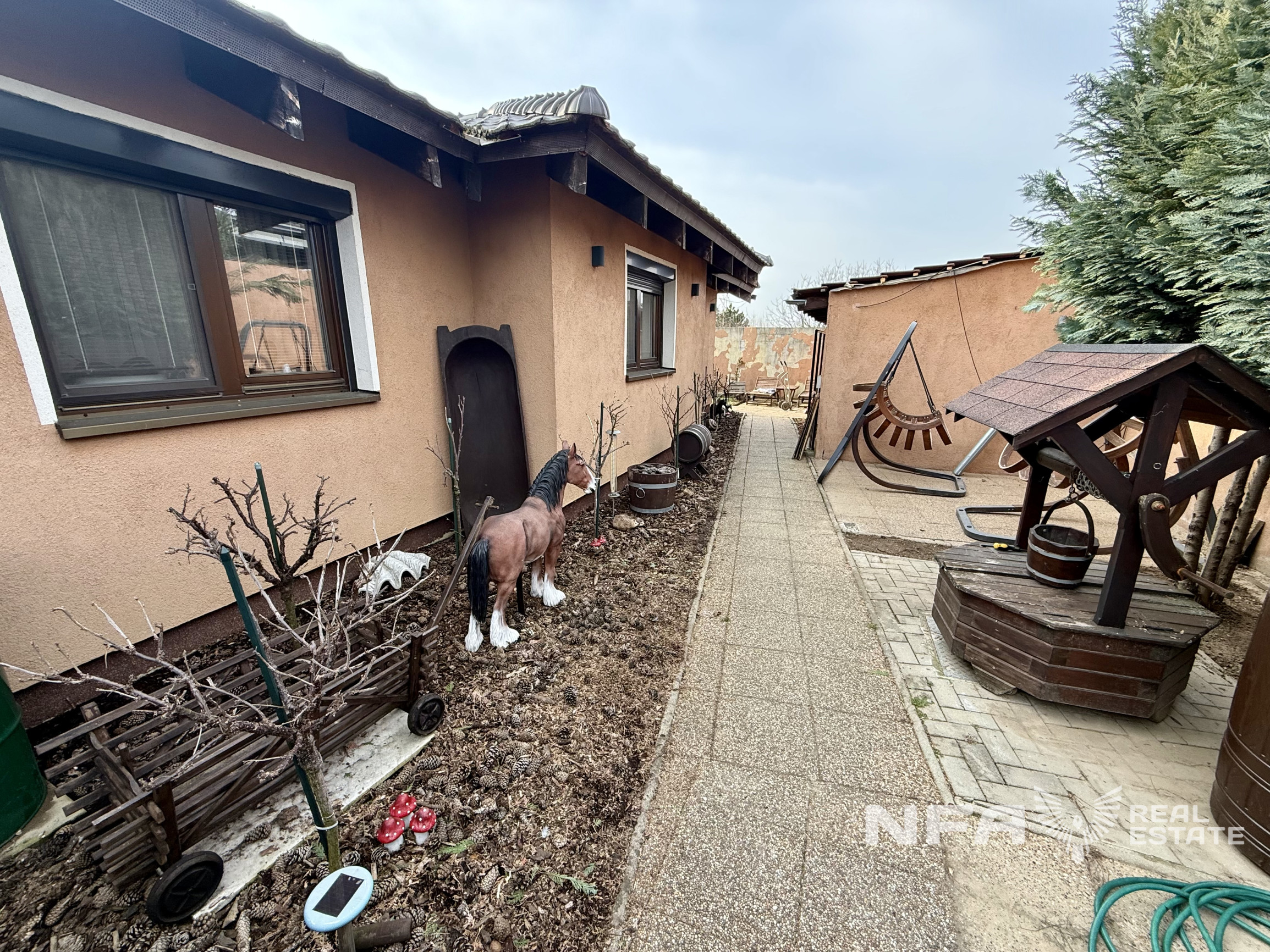 Na pozemku sa nachádza vonkajšie parkovanie s prístreškom pre približne päť áut, ako aj ďalšie technické a úložné priestory okolo domu. Celý pozemok je ohradený betónovým plotom. Nehnuteľnosť je orientovaná na severovýchod a vďaka svojej polohe a oploteniu poskytuje maximálne súkromie a pokojné, tiché bývanie.